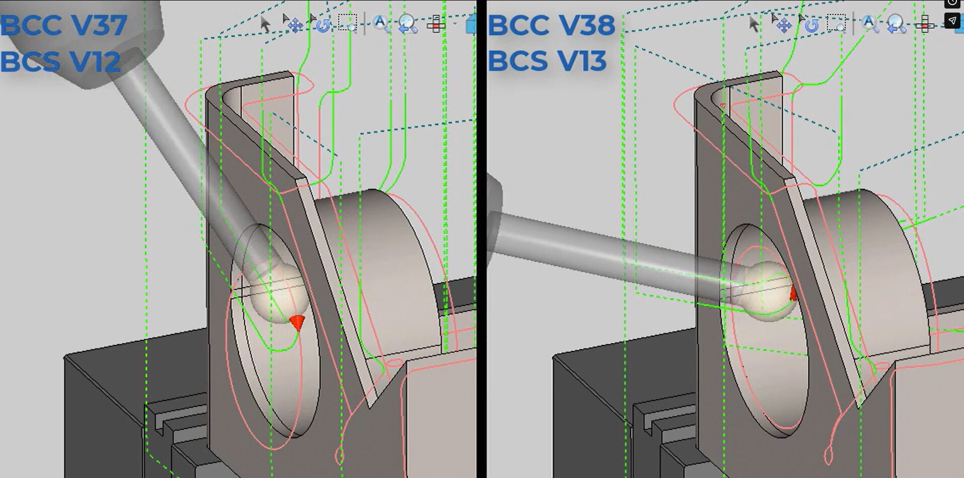 同時5軸動作のツールパス計算を改善し、不要な5軸動作を最小化。3軸+2軸の加工を増やすことで、剛性の高い動作と優れた表面仕上げを実現します。設定は不要で、ツールパス計算は自動で処理されます。